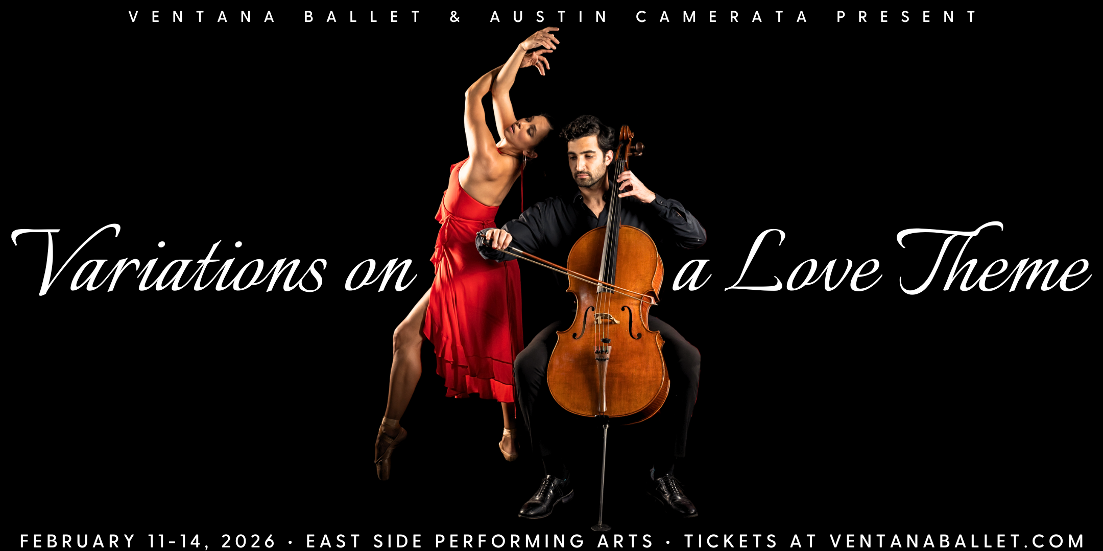 February 1, 2026—Ventana Ballet & Austin Camerata enchant the ATX performing arts scene again with Variations on a Love Theme in their fourth annual co-presentation. An Austin favorite, this intimate show brings the audience up-close-and-personal with the art. Limited seating at each showing immerses the guests in an unforgettable experience, as they travel through 6 different love stories, just feet away from professional dancers, musicians, and poets.